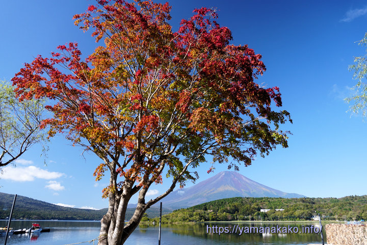 紅葉と富士山早朝は霧に覆われていた山中湖ですが、8時過ぎにはその霧も晴れて青空が広がり、「天高く馬肥ゆる秋」という言い回しが思い浮かぶ空となりました。残念ながら富士山の雪はなくなってしまいましたが、紅葉がまた秋を感じさせてくれます。