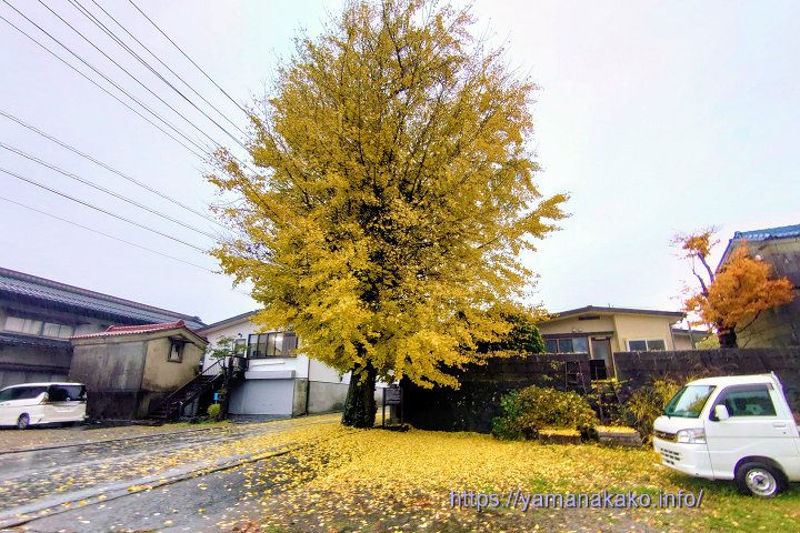 昨日は平野寿徳寺のイチョウを紹介しましたが、今日は山中明神前交差点近くにある巨木「袈裟がけの銀杏(イチョウ)」を撮ってきました。こちらも昨日より黄葉が進み、昨夜からの雨で根元には黄色い絨毯ができていました。