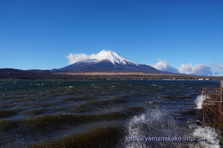 山中湖の波しぶき昨夜は台風のように風雨ともに強く大荒れで、今朝になって雨がやんでからも強風が吹いていて、山中湖は白波が立っています。富士山は昨日に比べると雪が増えて、5合目辺りまで白くなったように見えます。