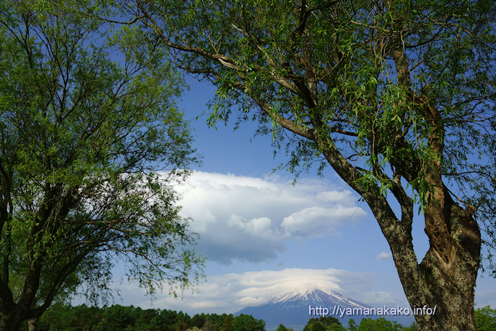 今朝は富士山に笠雲がかかり、吊し雲も出ていましたが、あまり格好良くはならなかったので、山中湖交流プラザきららの臨時駐車場にある柳と撮ってみました。新芽の緑がきれいで地元の写真家が撮影していたので、混ぜてもらいました。