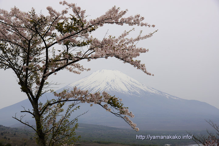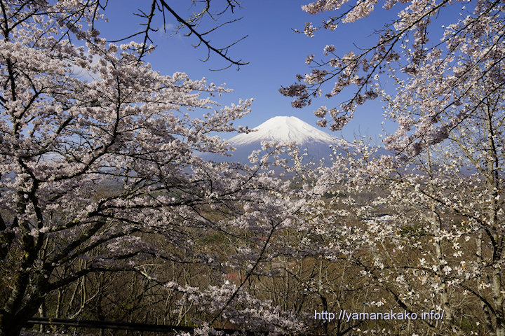 桜と山中湖越しの富士山が見られる場所は数少なく、その中でも一番いいポイントだった長池湖畔ですが、今年は枝が少なく葉っぱも出てきていて、あまりいい感じではありません。きらら前の湖畔から撮るのが一番いいかもしれません。