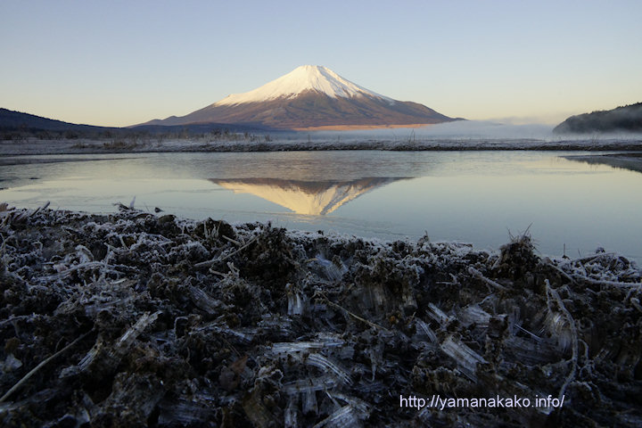 12月8日には明神山山頂の長い霜柱を投稿しましたが、今日は少し短めの霜柱がきらら前の湖畔にあったので撮ってみました。逆さ富士も入れようと思ったらなんと山頂が写っていませんでした。ここなら手軽に行けますので、霜柱の上を歩いてサクサクとした感覚を味わって下さい。