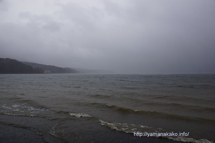 早朝より雨が降り始め風も強く吹き、荒れている山中湖です。この時期、湖にたくさん浮かんでいるわかさぎ釣りドーム船も、今日は荒天のため欠航しているようで、見られませんでした。
