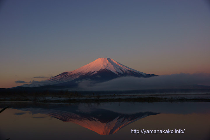 連日いい天気が続いていて、2016年最後の日、大晦日も快晴の朝で、風もなく湖が穏やかだったので、ピンク色に染まったきれいな逆さ富士が見られました。