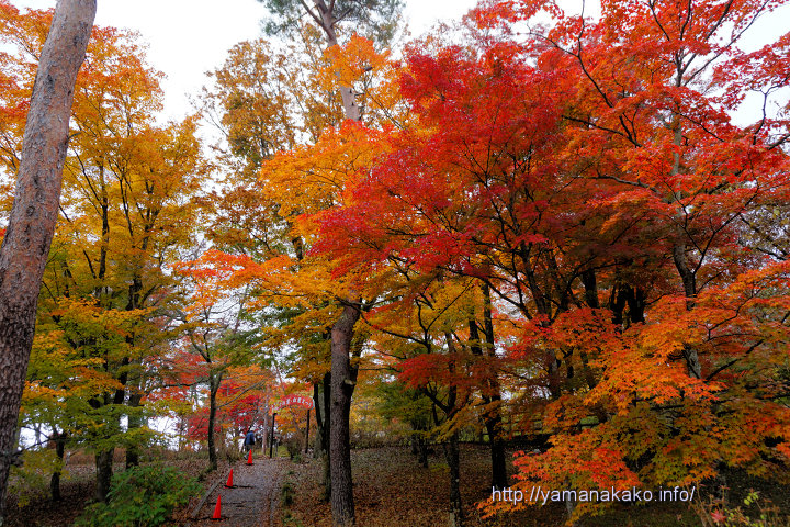 山中諏訪神社の裏手にある森の紅葉も写真のようにきれいですが、昨日からの雨でだいぶ葉が落ち、遊歩道は落ち葉で覆われていました。乾いた落ち葉の上をサクサクと歩くのもこの時期ならではですが、今日は雨で湿っているのでサクサクではありません(^^;