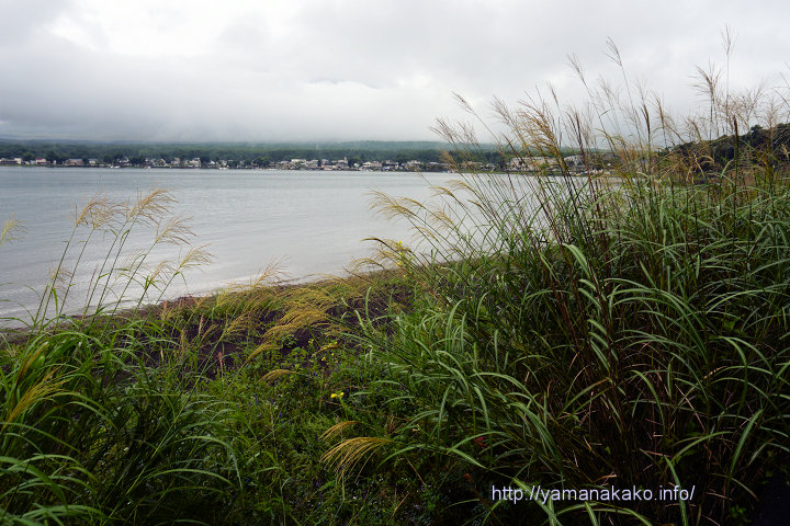 湖畔のススキ8月下旬となりススキの穂が開いてきて、夏の終わりを感じます。この雲の向こうには富士山があるはずですが、心の目で見てください。