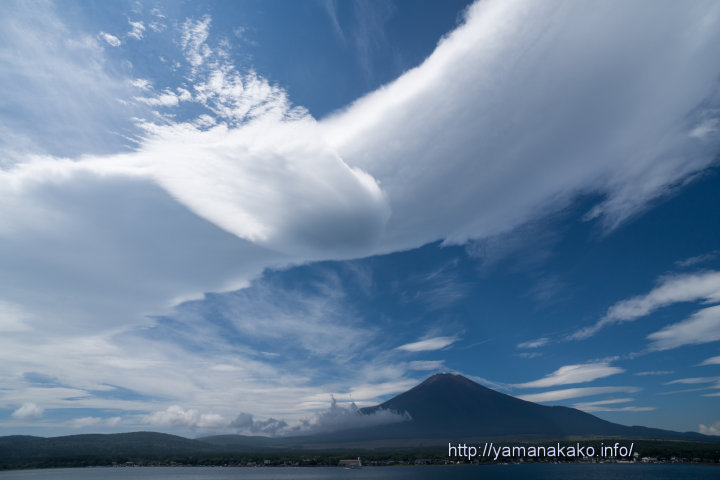 富士山にかかる吊し雲昨日から富士山には吊し雲がかかっていて、昨日の投稿でも同じ位置に雲がありましたが、雲が多くてよくわかりませんでした。今日は青空の中の吊し雲だったのでよく見え、刻々と形が変わりずっと眺めていたい感じでした。