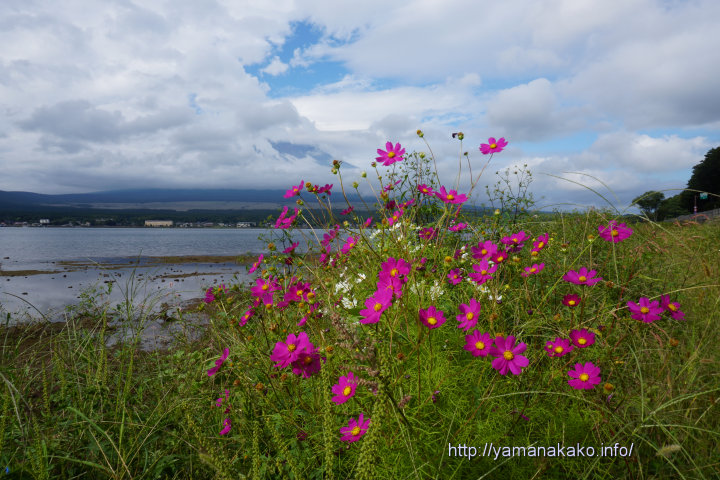 湖畔のコスモス先日紹介した湖畔のコスモスの花が増えてきたので、富士山をバックにまた撮りたいと思っていましたが、タイミングが合わずまだ撮れていません。そうこうしているうちに散ってしまいそうなので、富士山は雲に遮られていますが、花だけでもと思って撮ってみました。