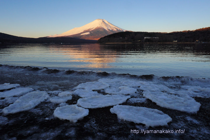 氷に映る逆さ富士今朝は湖の端が少しだけ凍っていて、そこに映る逆さ富士を狙ってみました。風が吹いていたので氷のないところは、さざ波となっていましたが、氷の上に乗った水は風の影響をあまり受けないので撮ってみましたが、山頂付近は氷のヒビになってるところに映ってゆがんでしまいました。