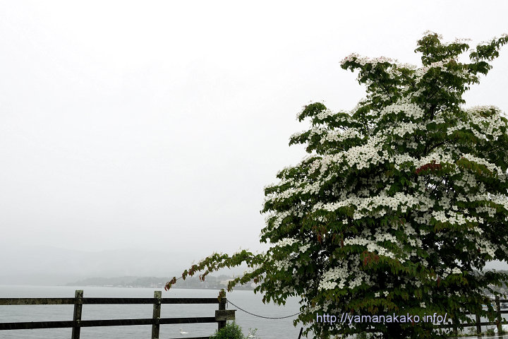 湖畔のヤマボウシ昨日から雨が降り続いていて、湖も雨で煙って対岸がよく見えません。そんなわけで今朝は湖畔駐車場脇に植えられているヤマボウシを撮ってきました。花びらのように見える総苞片が真っ白で、ちょうどきれいな時期となっています。