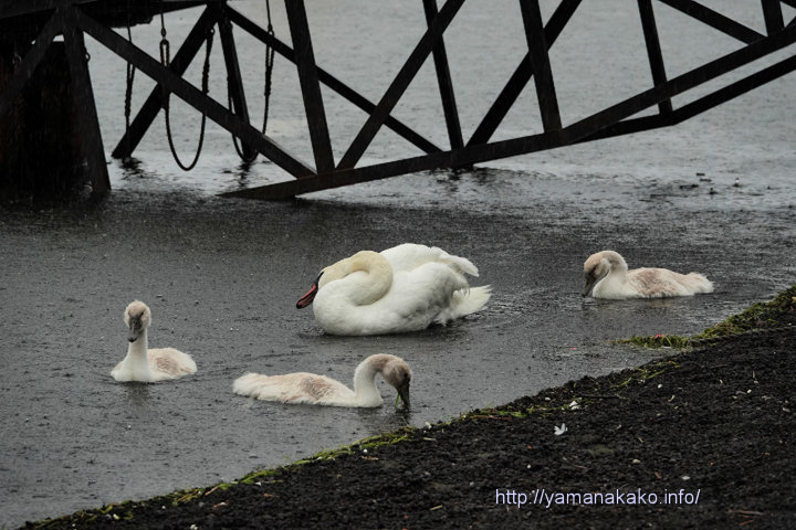 湖畔でくつろぐ白鳥親子今朝は激しい雨でしたが、白鳥の親子はいつもと変わらず、のんびりと湖畔でくつろいでいました。5月の中旬ぐらいに孵化した子どもたちはこんなに大きくなって、人間でいえば小学生から中学生ぐらいの感じに見えます。