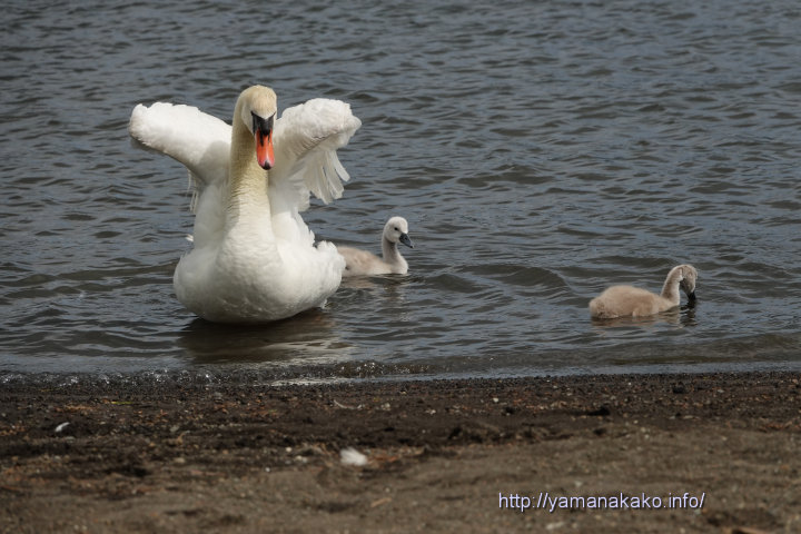 白鳥親子今朝は白鳥親子を旭日丘湖岸で見かけ、シャッターを押そうと準備をしていたところで、親鳥が羽ばたき、残念ながら羽根を広げている瞬間は捉えられず、もうちょっとで閉じるところでした。ヒナたちは少し大きくなりましたがまだかわいいです。