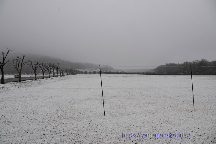 雪で真っ白になった芝生広場明け方までは雨が降っていたんですが、明るくなってからみぞれになり、その後雪になって本格的に降っています。写真は9時頃の花の都公園ですが、さらに降っているので真っ白になっています。午後まで降り続く予報なので、5cmぐらいは積もるかもしれません。