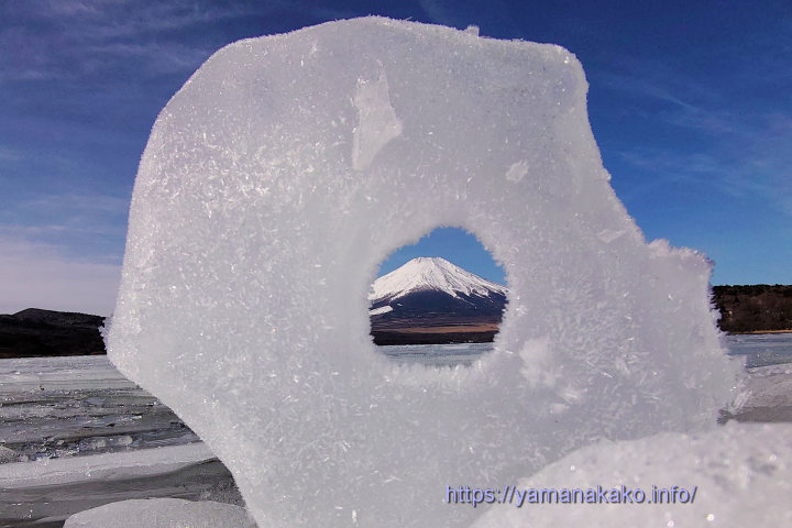 氷の穴から富士山平野地区の氷はずいぶんと減って、今朝は北寄りの風が強く吹いていたので、岸に打ち上げられていました。そんな中、丸い穴が開いていた氷があったので、その中に富士山を入れてみました。昨日から今日にかけて氷は激減したので、明日まで氷は残っているかな~。