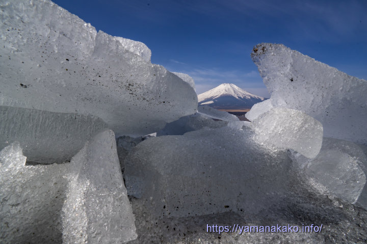 湖畔に打ち上げられた氷昨日、平野ワンドに浮かんでいた氷はすっかりなくなり、その氷が湖畔に少しだけ打ち上げられていました。もう見られないと思っていた氷と富士山ですが、今日もなんとか見ることができました。これで本当に最後かと思います。