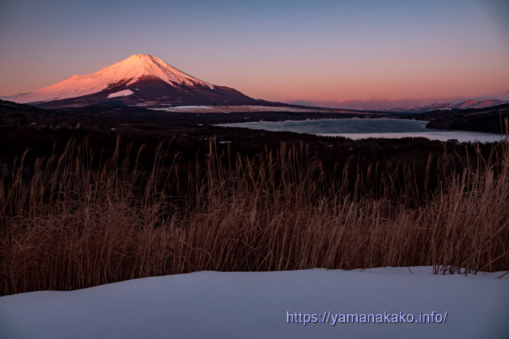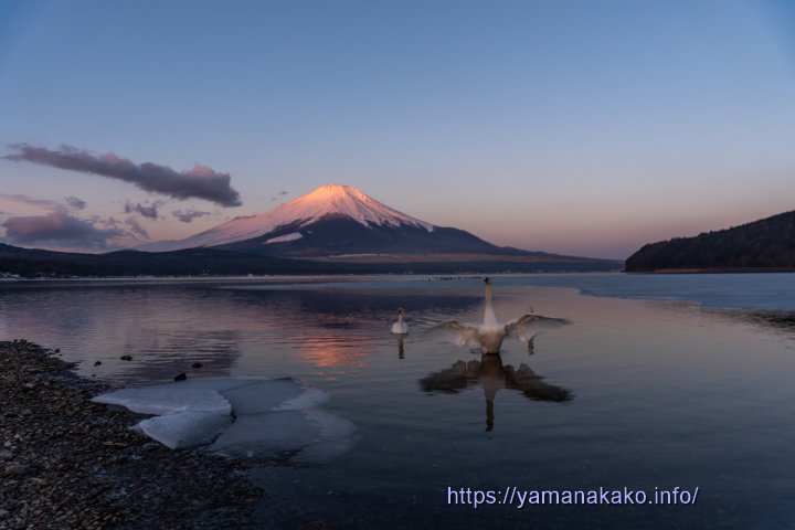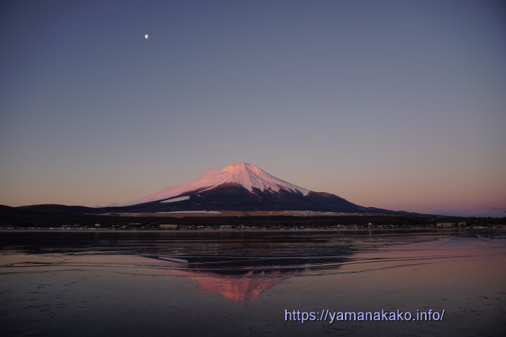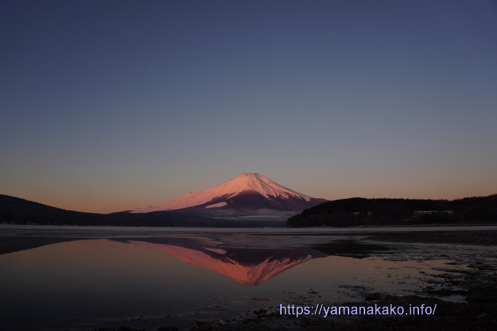 ピンク色に染まった富士山今朝も空気が澄んでいて、少しピンク色に染まった富士山が見られました。昨日紹介した平野地区は結氷しています(上れません)が、今朝のこの場所は縁が少し凍っている程度で、そこにピンクの逆さ富士が見られました。