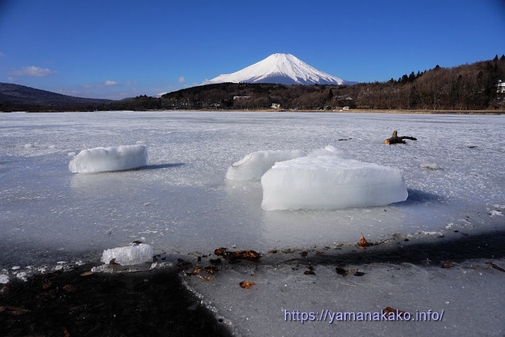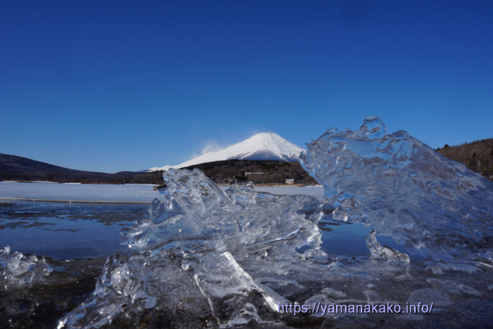 湖畔に打ち上げられた氷早朝は曇っていて富士山が見られませんでしたが、8時頃から晴れてきて見えるようになったので、湖畔に打ち上げられていた氷と富士山を撮ってみました。今日も湖畔の氷はいろいろな表情を見せてくれて楽しめました。