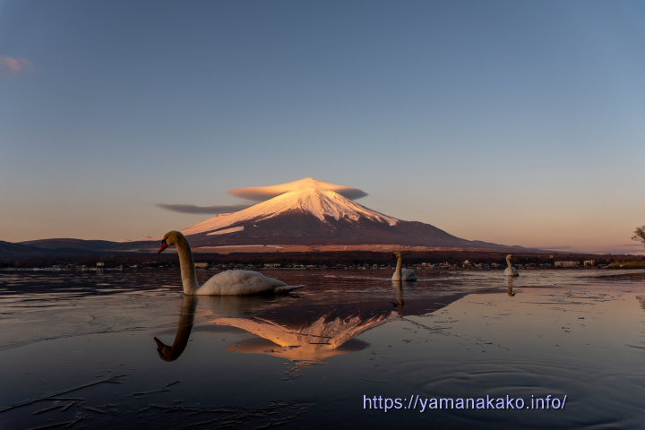 笠雲を被った富士山と白鳥今朝は笠雲がかかっていて、刻々と変化する様がとても面白く、しばらく湖畔をうろうろしながら眺めていたところに、白鳥がやってきてきれいな逆さ富士が見られなくなりました(^_^;)
