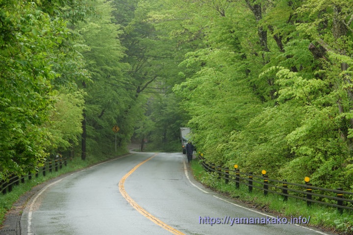 木々の新緑がすがすがしいゴールデンウィーク頃から山中湖周辺の木々は芽吹き始め、道路脇の木々の新緑がとても美しい季節となりました。この場所は両側の木々が美しく、雨でも爽やかな気分になります(^^;)