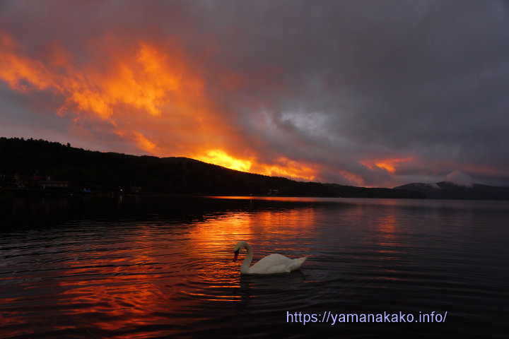 白鳥と朝焼け 早朝は曇っていて富士山も見えなかったので、撮影には出かけないつもりでしたが、東の空が染まり始めてきたので、湖畔から朝焼けを撮ってみました。ほんのちょっとだけですがなかなかきれいでした。