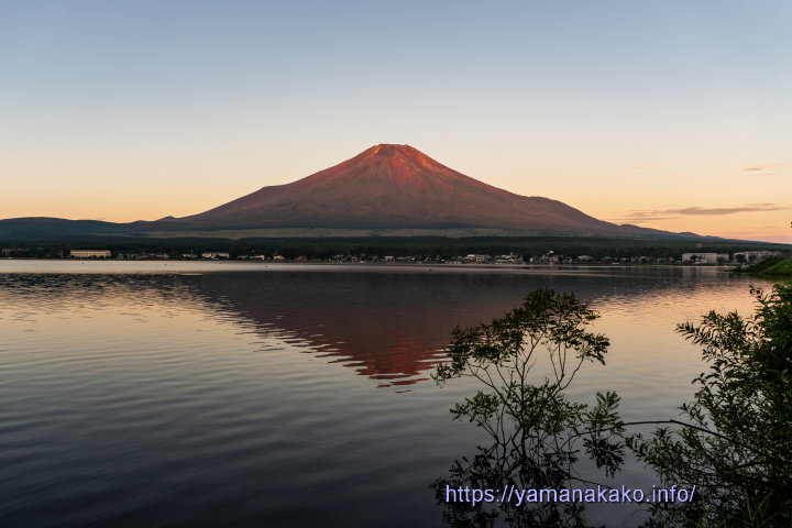 今朝はすっぴんの富士山 今朝は久しぶりに朝からいい天気で、すっぴんの富士山もちょっぴり赤く染まって見えました。台風7号の影響で山中湖の水量がだいぶ増えて、写真のように陸地にあった木も水の中から生えているようになってしまいました。