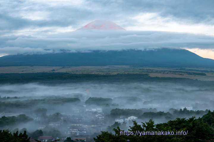 富士山頂が雲に遮られて残念 今朝は雲がありましたが、山頂が少し見えていたので、山の中腹まで行けば見えるだろうと行ってみましたが、着いた途端に雲が出てきて山頂はうっすらとしか見えませんでした。眼下は薄い霧で覆われていてなかなかいい感じだったので、あと5分早ければよかったのに残念でした。