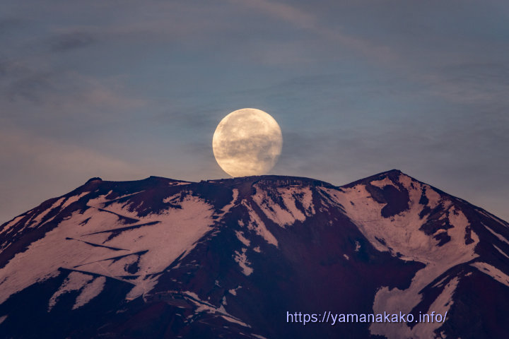 富士山頂に沈む月今朝は忍野村から赤く染まった富士山に月が沈む日でしたが、東の空の雲が厚く赤富士にはならず、月も雲にちょっと邪魔されてしまいました。それでもこのくらい見えたので、行った甲斐はありました。