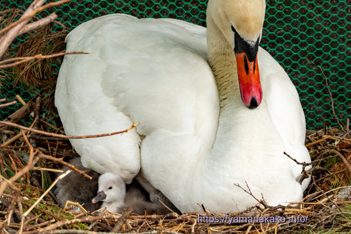 白鳥のヒナ誕生5月10日頃から白鳥のヒナが孵り始め、写真の巣では昨日から4羽が孵り、まだ卵が3個残っていました。今朝は1羽が巣の外に出ていて、カラスに狙われていましたが、人が近づくとカラスは逃げ、しばらく見張っていました。すると餌やりの時間になって白鳥おじさんがやってきて、その助けでなんとか巣の中に戻り無事でした。ちゃんちゃん。