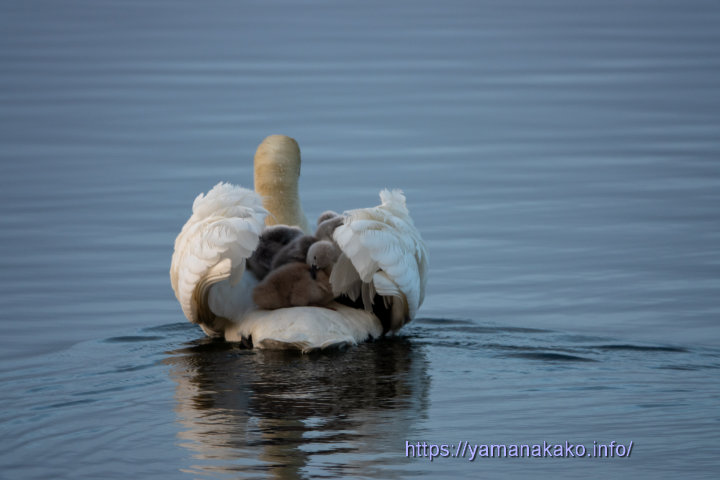 泳ぐ白鳥親子先週の金曜日はサイクリングロードを散歩していましたが、今朝は親子仲良く泳いでいました。日々成長しているようで1週間前よりかなり大きくなったように感じます。