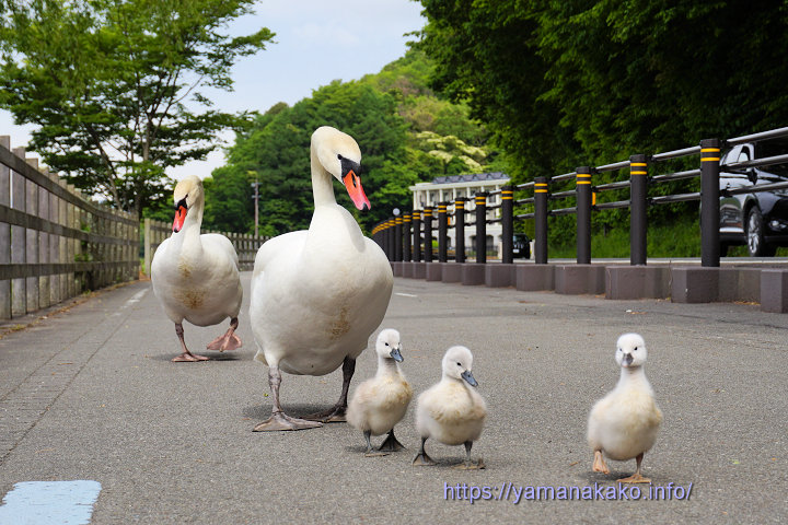 散歩中の白鳥親子道路を走っていたら、サイクリングロードを散歩中の白鳥親子を発見したので、戻って見てみたら、湖畔への降り口からだんだんと離れて行って心配しました。が、しばらく歩いたあと後Uターンしてサイクリングロードから、降りられたので安心しました。ここまで上がってくるのはめずらしいですが、事故にも遭わず無事帰れてよかったです。