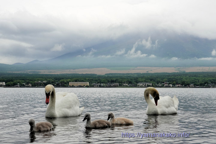 霧の向こうに富士山、手前に白鳥親子早朝は富士山がよく見えていましたが、すぐに霧に覆われて見えなくなってしまいました。このときは山頂だけが見えていて、手前に小さく白鳥親子が写っています。小さくてよくわからないと思いますが、ヒナは全部で5羽いて、1羽は親鳥の背中に乗って頭だけ出しています。