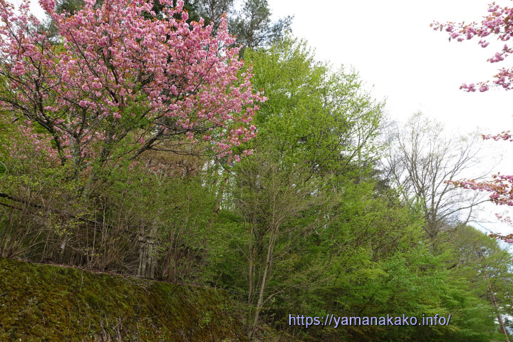 新緑と八重桜先日お伝えした八重桜が各所で咲き出し、新緑とともにとても鮮やかできれいです。写真は花の都公園内にある八重桜です。