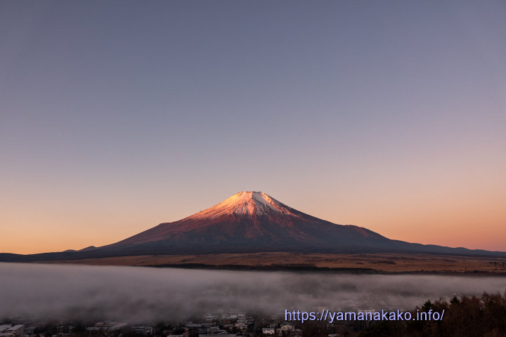 紅富士の逆さ富士今朝は湖の縁が少し凍っていて、その上に水が乗ると鏡面になるので、そこに映る逆さ富士は波立たないのでとてもきれいです。冬の朝は湖の氷や霜がいとをかしく、いろんな発見があります。