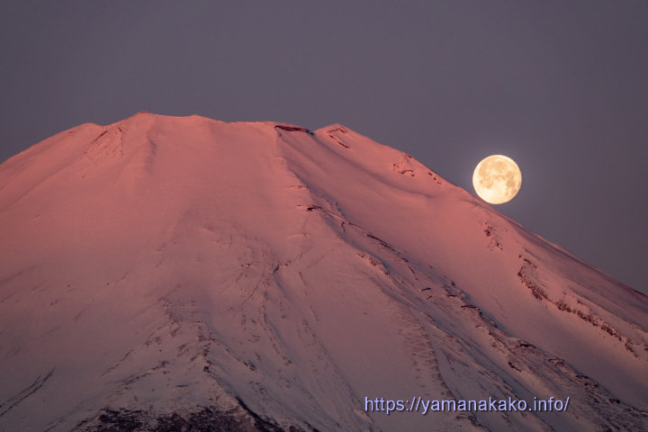 満月とピンク富士今日は山中湖畔から富士山頂に月が沈むパール富士が見られる日でしたが、その時間は富士山に日が当たらないので、少しずれた場所から紅富士と月を撮ってみました。昨日の雨で空気が洗われて、富士山はすっきりくっきりときれいに見え、ピンク色に染まりました。