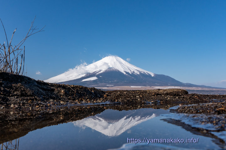 水たまりの逆さ富士今日は湖岸が少し凍っていましたが、なぜかこの小さな水たまりは氷が張っていなくて、写真のような逆さ富士が見られました。