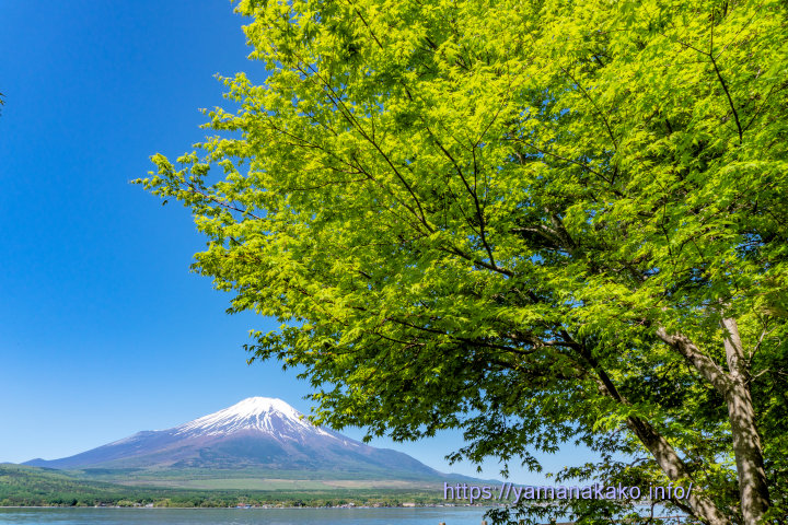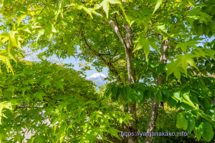 新緑の中に富士山秋は紅葉がきれいなこのもみじの額縁、今は若葉が出てきて爽やかな色の「新緑の額縁」となっていたので、小さな富士山を入れてみました。
