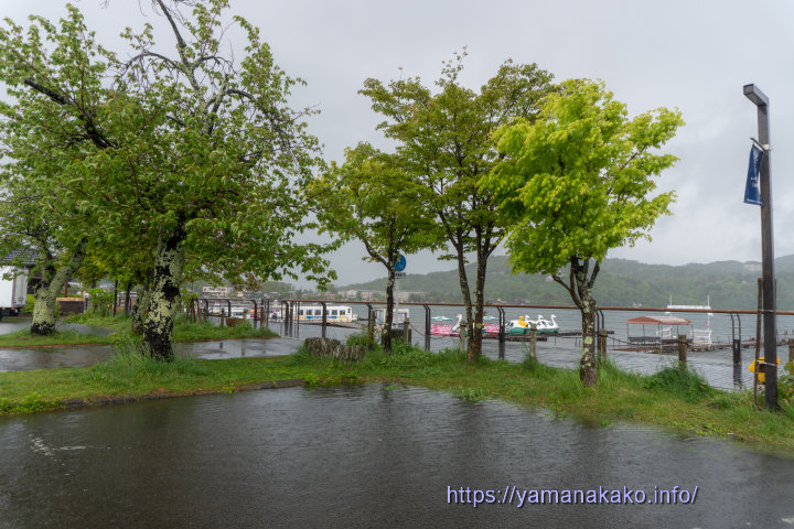 水たまりのできた駐車場夜中から雨が降り始め、夜明け前はかなり激しく降ったせいか、ここの駐車場には大きな水たまりができていて、深いところは20cmぐらいありました。今日はこのまま夕方まで雨は降り続くようですが、夜明けまのような激しい雨とはならない予報となっています。