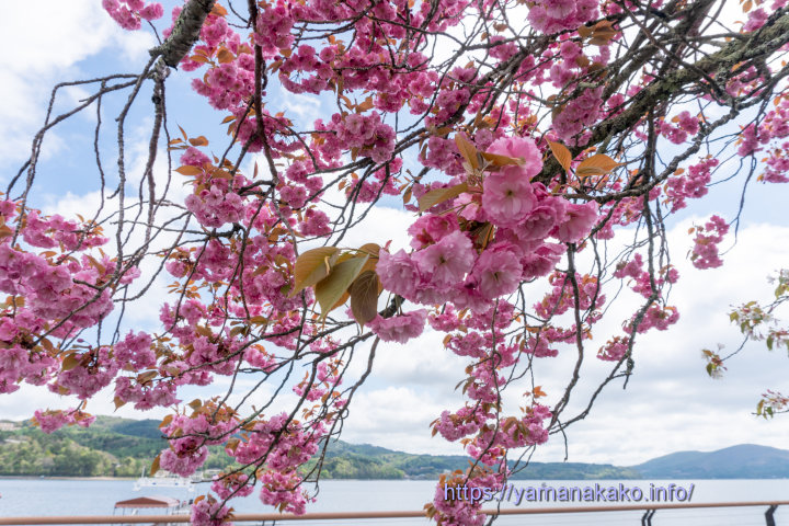 湖畔に咲く八重桜先日紹介した旭日丘湖畔緑地公園の八重桜は見頃を過ぎてしまいましたが、山中湖村役場付近や湖畔にポツポツとある八重桜が見頃になりました。写真の山中遊覧船乗り場では、ちょうど満開となっていました。