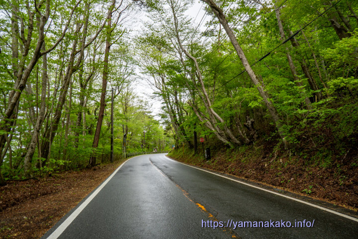 新緑に囲まれた道桜の季節が終わり、木々の新芽が出てきて、雨の日でも若葉の緑が美しく、すがすがしい気分にさせてくれます。