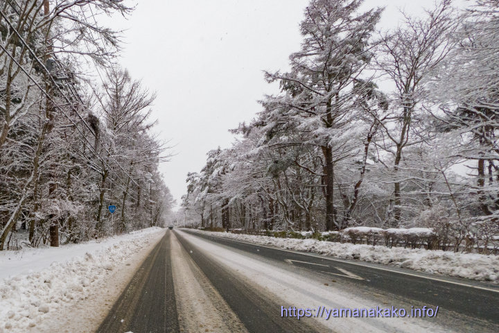 雪の積もった国道138号線昨日の夜から雪が降っていて、15cmほどの積雪となり、道路にも雪が残っていてスタッドレスタイヤ等必須の状況です。この後も雪が降り続く予報となっているので、意外と積もるかもしれません。