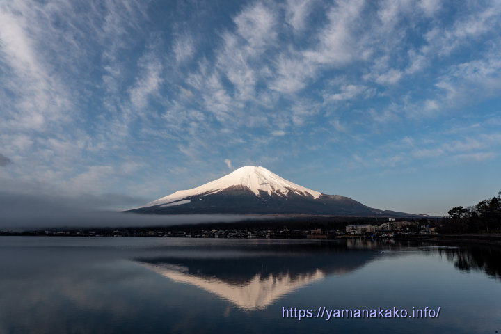 逆さ富士に高層の雲今朝も紅くはならなかったもののすっきりとした富士山が見られ、高層の雲が空に広がってきていい感じでした。この後は低層の雲が富士山にかかって、だんだんと見えなくなってしまいました。