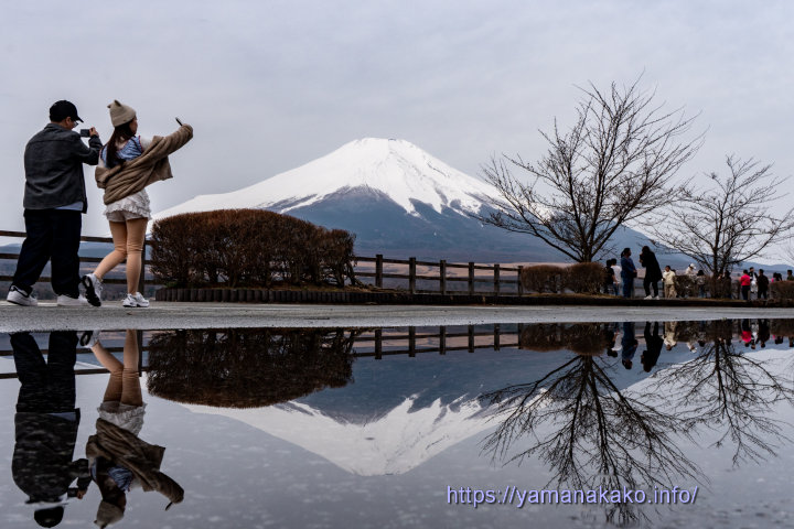 雨上がり限定逆さ富士昨夜、雨が降ったので長池親水公園には水たまりが残っていて、そこに逆さ富士が見られました。今日もここにはバスが泊まっていて、多くの海外の観光客が写真を撮っていました。