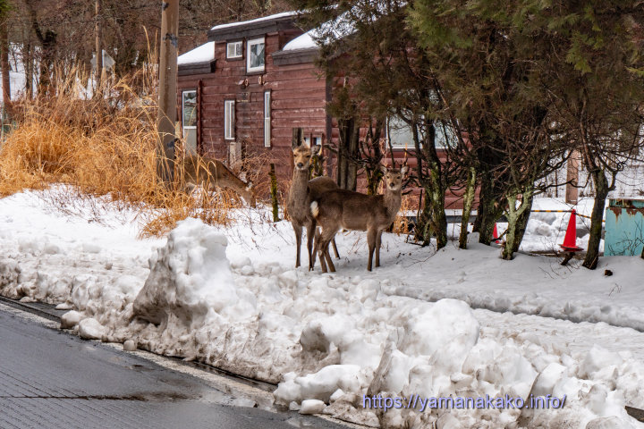 道端の鹿以前から朝晩は鹿をよく見かけていましたが、最近は昼間でも見かけるようになり、今朝は国道沿いに3頭の鹿がいて、何か食べていました。鹿は道路をよく横断しているので、運転の際にはご注意ください。
