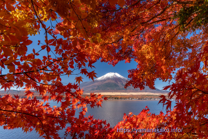 紅葉と富士山昨日は曇り空でしたが、今日は朝からいい天気で青空が広がり、紅葉も富士山も映えました。写真は山中湖交流プラザきららからですが、夕焼けの渚・紅葉まつりが行われている旭日丘湖畔緑地公園の紅葉もまだきれいです。会期は16日(日)まででまだきれいに色付いていると思いますので、是非お出かけください。