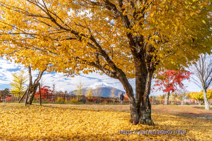 上も下も黄葉今日は風がなく冷え込んだので、黄葉が一気に落ちて、黄色い絨毯のようになって、まだ葉も残っていたので、上も下も黄色く、その間に富士山が見られました。向こう側に見えるように葉を落とした木も増えてきましたが、まだきれいに色付いているのが多いです。