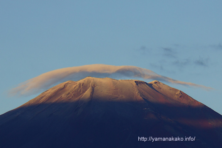 富士山頂はうっすらと白く日が出る前に富士山がうっすらと白くなっているのが見えたので、湖畔に行ってみましたが、山頂にちょっと日が当たっただけで、その後は写真の笠雲が大きくなり、隠れてしまいました。私的には今シーズン2度目の冠雪(1度目は9月11日)となりますが、甲府地方気象台からはまだ見えていないようなので、初冠雪はお預けのようです。