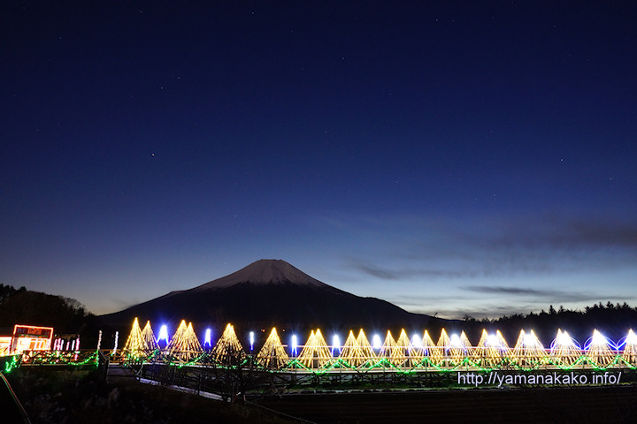 山中湖アートイルミネーション昨日の夕暮れはいい天気だったので、花の都公園で開催されている山中湖アートイルミネーション会場から、富士山をバックにイルミネーションを撮ってみましたが、ちょっと時間が遅かったのか、月がまだかけているので光が弱いからか、いまいちでした。今週末はかなり満月に近くなるのでもう少しきれいに撮れるかもしれません。