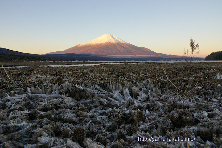 今朝は風が強く、小さな水たまりでも波が立っていて逆さ富士は見られませんでした。被写体を探して歩き回っていると、サクサクと音がして足裏の感覚もいつもと違うので、足下を見たら霜柱が立っていたから超ローアングルで撮ってみました。長いものは5cmぐらいあり、この上を歩くととても気持ちいいです。