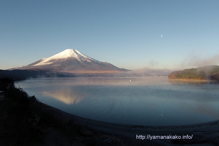今朝はパノラマ台から紅富士と月を狙ってみましたが、残念ながら富士山になかなか日が当たらず紅く染まりませんでしたので、平野湖畔のいつもとはちょっと違う高いところから撮ってみました。