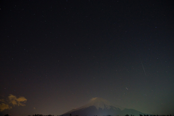 昨夜はふたご座流星群が極大日を迎えるということで楽しみにしていて、19時ごろから見に行こうと思っていましたが、雲が多く出ていて断念していました。それでもと思って21時ごろに外に出てみると、先ほどの雲はどこかに行ってしまい、空にはたくさんの星が輝いていて、流れ星もいくつか見えたので、慌てて空が広く見える場所に行ってカメラをセットして撮ってみましたが、うまく撮れずこれが一番いいものでした。肉眼ではかなりの数が流れていたのに残念でした。